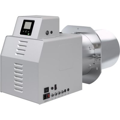 Burner for industrial heating. The compact dimensions make it easy to combine with different types of heating systems. Designed with round combustion chamber, variable speed fan, internal auger for a more effective dosage, igniter and flame detection photocell. For a more complete and reliable cleaning it is also possible to connect the device to an air compressor. The burners is managed by a microprocessor control panel mounted on the appliance. Industrial power, ideal for medium-sized industrial environments, boilers, hot air generators and baking ovens. Equipped with removable display unit. High quality materials for long term performances. Output: 200 kW.