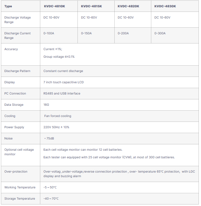 Battery Discharge Tester is used to perform discharge testing which is the only verifiable method to determine actual capacity of battery systems. Whether you proceed the loading test, discharge testing , acceptance testing, battery capacity testing, KV hipot can provides a full series of customzied DC load banks with many different models. They covers a wide voltage range from 10V to 600V which is widely used on various fields . With optional cell voltage monitor (CVM), discharge data of each cell battery can be monitored directly connecting with battery load bank . The data software can provide user with data report and data graph.
