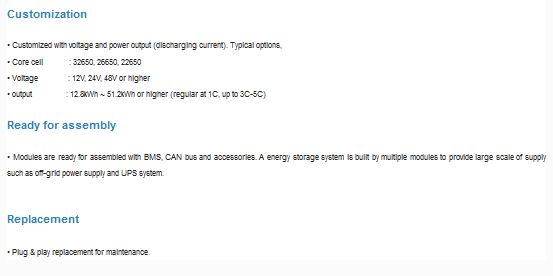 For higher voltage and output power applications, multiples of LiFePO4 cylindrical cells are assembled and framed to build a battery module. The module with customized voltage and power output ( discharging current ) is ready to integrate any applications.