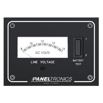 Completely pre-wired to reduce installation time. Over 2000 interchangeable function labels available. Panel is 1/8` corrosion resistant aluminum coated with. two-part polyurethane. 2 1/2` edge lighted analog meter with front zero adjust. Optional. DIGITAL meter with 0.56` numeric, red LED, display. Standard Voltage 12V. 24V and 32V OPTIONAL. Battery Test: Monitor two battery banks with a Euro-style rocker switch. Metering: 8-16 Volt expanded scale is standard. Other analog scales and DIGITAL meters are. also available. Dimensions: 5 1/2` W x 4 1/8` H x 2 1/4` D.