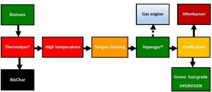 In the thermolysis step, the biomass is separated into a solid and gaseous fraction. More than 50% of the carbon enters the biochar and the gaseous fraction undergoes a high temperature process in the second stage. The resulting syngas is purified with water, oil and activated carbon. This creates Hypergaz. This in itself almost clean gas can be burned in a gas engine to get heat and electricity. This will only happen in a project if the amount of hydrogen in the initial phase is too large to be sold.