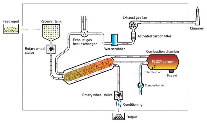 This pyrolysis system utilizes the heat self generated by the syngas oxidation to sustain its own process without the need of external heat sources (like fossil fuels). The process generates heat in the form of hot water that can be used for drying or other needs.