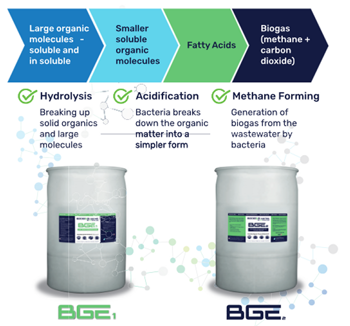 BGE2 by ELI BioSciences is a blend of humates and humic substances and beneficial bacteria which promotes enhanced microbial oxidation of difficult and slow-to-de-grade organic waste matter, resulting in a significant increase in biomass activity in degrading waste organic solids.