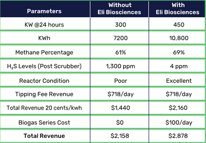 Eli Biosciences effectively increas biogas yield and methane percentage, while reducing hydrogen sulfide levels by 70% after 21 days of treatment. Completely removing his annual cost of $40,000 for iron hydroxide input.