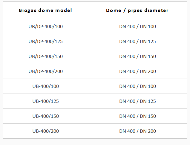 Biogas dome is first technological element of biogas network. Domes are mounted at digester/anaerobic reactor roof. Biogas dome is equipped with two cut-off valves used to direct biogas flow to biogas network or to atmosphere through outlet chimney. Biogas dome is also equipped with pressure gauge and connector pipes for biogas measurement. Biogas dome can be additionally equipped with filter bed made of polypropylene rings for emergency foam stop which can be formed during digestion process. Dome is also additionally equipped with top and bottom manhole, connector pipes for pressure measurement as well as process water/liquid sprinklers for filter cleaning. Biogas dome can be also optionally equipped with foam detector. Biogas dome as a whole device is made of stainless steel.