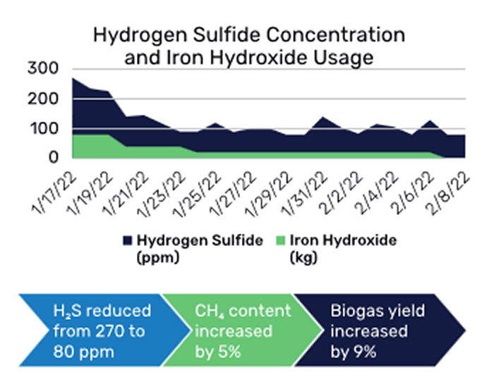 Eli Biosciences effectively increas biogas yield and methane percentage, while reducing hydrogen sulfide levels by 70% after 21 days of treatment. Completely removing his annual cost of $40,000 for iron hydroxide input.