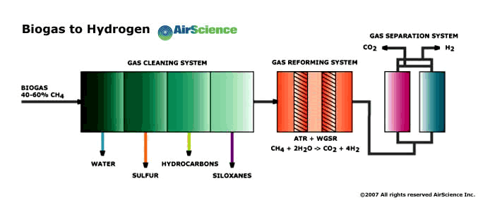 The Terragas process jointly developed by Unitel Technologies and AirScience Technologies, converts biogas from municipal solid waste landfills, anaerobic digesters of waste water treatment plants and other sources to high purity hydrogen.