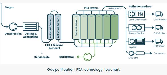 PSA technology converts biogas into vehicle fuel and biomethane that is injected into the grid