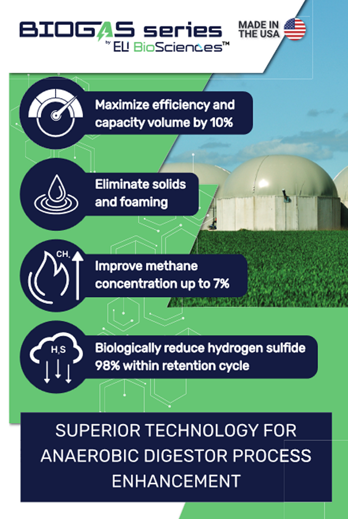 Eli Biosciences effectively increas biogas yield and methane percentage, while reducing hydrogen sulfide levels by 70% after 21 days of treatment. Completely removing his annual cost of $40,000 for iron hydroxide input.