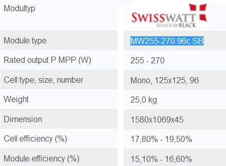 MONOWATT Modules SHADOW BLACK with 96 cells offer 4 performance classes designed for roof - or ground mounting. The modules are best suitable for small, medium and large scale solar systems for on- or off-grid operations. For All who like it BLACK: With black powdered frame and black backsheet. SWISSWATT technology, design and construction guarantee the highly efficient and reliable long term output of each and every module. Our automatic production and our latest flash tower technology guarantie a documented performance above industry standard.