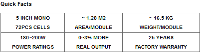 Through advanced solar cell and manufacturing technologies, this full-black panel delivers performance efficiency up to 15.70% with the highest output power to 200W. With a small and compact format, it is very easy to handle and install on a roof, and to maximize the use of your roof spaces. Our industry-leading linear performance warranty guarantees your return on investment over the time.