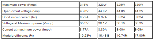 Soalr cell 156*156mm. No.of cells 72 pcs ( 6*12 ). Dimensions 1956*992*40mm. Weight 23.0kg. Front Glass 3.2mm tempered glass. Frame Anodized aluminium alloy. Junction Box IP65/IP75 rated (3 bypass diodes). Connectors MC 4 compatible. Mechanical load test 5400Pa. Operating module temperature -4℃ to + 85℃. Maximum system voltage 1500V DC (IEC)/600VDC (UL). Maximum series fuse rating 15A. Power tolerance 0/+5W.