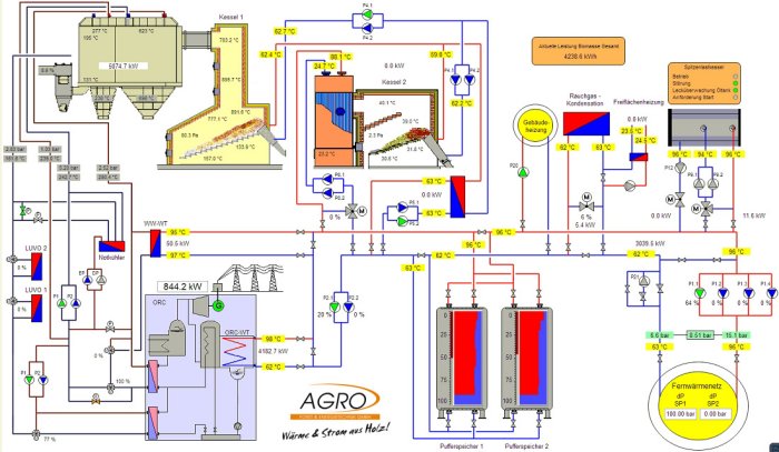 AGRO boiler house management is a control tailored to the particular needs of the user. It regulates the performance of individual boiler plants, largely dependent on buffer vessel management. AGRO boiler house management guarantees for all operating conditions of a heat station that the energy required by the process is generated and provided. AGRO boiler house management is particularly important in the optimisation of primary current consumption.