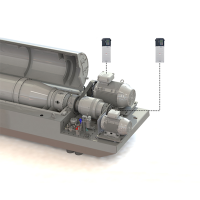 Electric motor with frequency converter control, bowl drive via V-belt. Electric motor with frequency converter control; generation of the differential speed with FSG-Drive gears; Bowl and scroll drives are decoupled