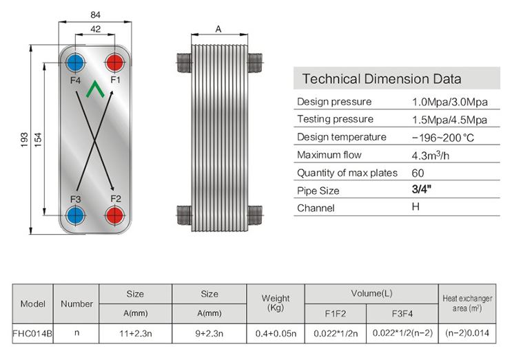 Design pressure: 1.0Mpa/3.0Mpa.Test pressure: 1.5Mpa/4.5Mpa. Design temperature: -196~200 °C. Maximum flow: 4.3m3/h. Quantity of max plates:60. Pipe Size:3/4". Channel: H.
