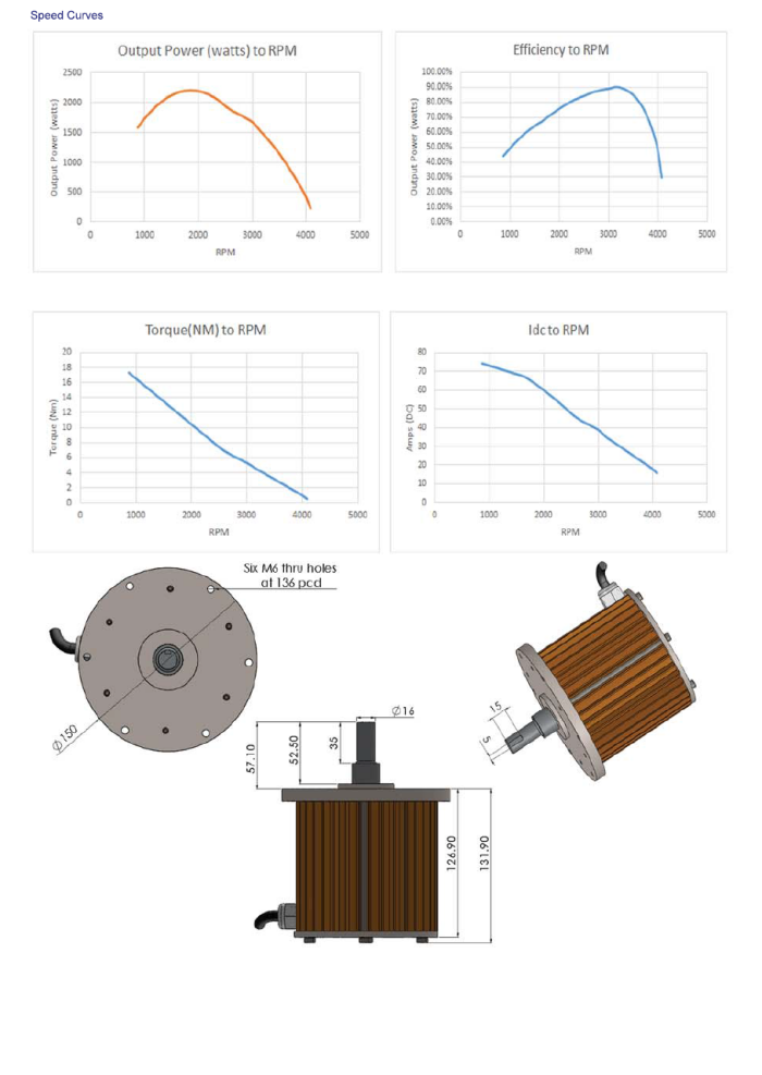 The 1.5 kW BLDC Motor is designed to maximize efficiency and increase battery life of your electric drive train. This unit is built to withstand heavy duty cycle and is frequently run for a continuous 6 hour stretch. Based on a 48V configuration, the motor is most commonly run with a max rated 50 amp controller with a continuous operation around 33 to 35 amps.