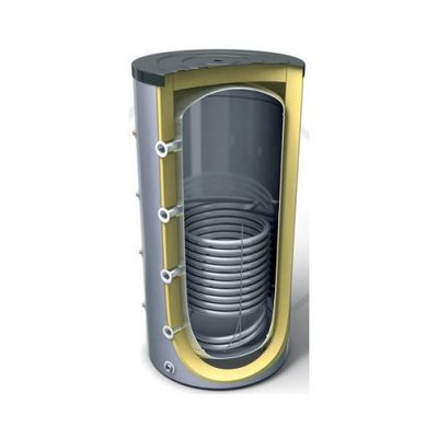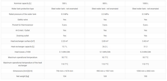Steel water tank - not enemaled. Highly efficient CFC FREE 50 mm polyurethane insulation. External Thermoindicator. Safety valve. 4 pockets for thermosensors. 4 + 5 system connections. Inlet connection. Airvent/Outlet connection. Draining outlet. Plastic cover.