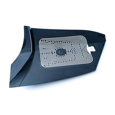 Here we also distinguish between classical printed Silver heaters and the carbon based heaters with an intrinsic strong PTC-effect. Normally, the heater structure is printed on a certain base material, which later on is directly inserted into the tooling of the plastic part. The heating element will then be back-injection molded, making it an inseparable part of the plastic component. With an ATT Patent protected method, a necessary electrical connector will be produced simultaneously to the injection molding process.