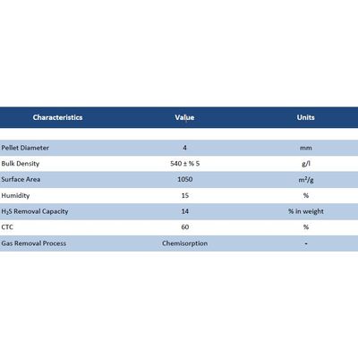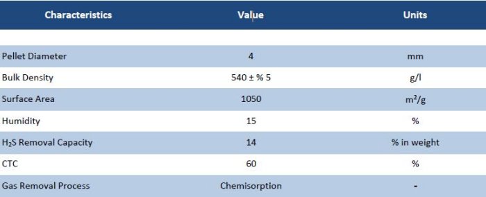 It is made of activated carbon of the greatest purity and of large surface area. Highly effective with Hydrogen Sulphide (H₂S) and Mercaptanes. In many cases the absorption capacity of the ULP-Bi-On NaOH can be restored by a two-phase caustic bath followed by water drainage. Target Gases; Hydrogen Sulfide (H₂S), mercaptans.