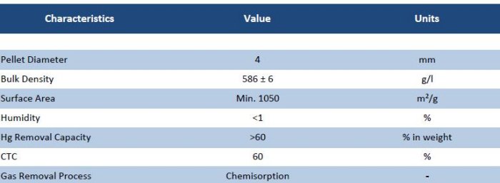 It is a bituminous activated carbon with Sulphur (S). Has excellent physical properties of the carbon and the high Sulphur content. Absorbs until 60% by weight. No risk of desorption because of chemical reaction (Hg + S → HgS). Suitable for a wide temperature range and humidity. The final product is stable. Target Gases; Mercury (Hg) vapours.
