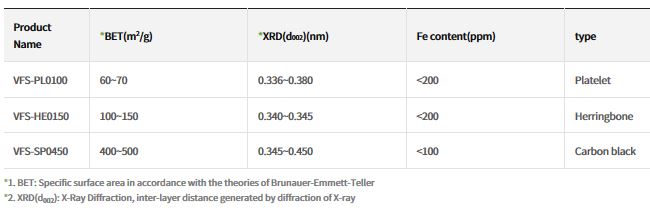 - Fibrous carbon & spherical : High crystallinity & high surface