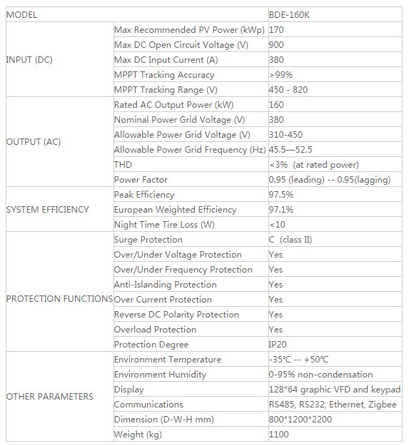 Advanced digital control techniques using the latest DSP Optimized anti-islanding technique for the highest system reliability. Optimized Maximum Power Point Tracking technique guarantees the maximum power output from the PV array User oriented Graphic User Interface (GUI) on an integrated. 128*64 graphic VFD and a keypad panel.. Support multiple communication protocols, including RS232/RS485/Ethernet/Zigbee etc. Complete protection functions to protect against reverse DC polarity, over temperature, over current, short cirucuit, over/under voltage ,anti-islanding, etc. Can be used at a wide range of environment temperatures and high altitude. Automatically power-on in the morning and enter a low power mode at night. No local operators required for daily operation.