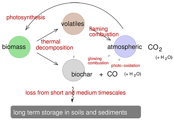 Looking at the diagram again, we see that carbon dioxide is drawn out of the atmosphere by plants, which convert it to cellulose and lignin and proteins and oils and all the other materials that make up biomass. When a fire comes along the volatile thermal decomposition products are combusted to carbon dioxide and water, thus putting carbon dioxide back into the atmosphere. But some fraction of the biomass always forms charcoal, so some of the carbon that was in the biomass is deposited in the biochar warehouse at each burn. Biochar is raw carbon. It does not have a defined structure like graphite and diamonds, but it is as un-reactive, as refractory, as those other kinds of carbon at normal temperatures-it is “sequestered” carbon, unavailable for further reactions.