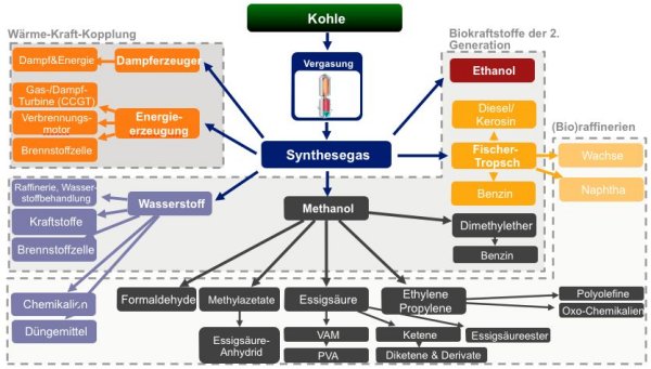 The CCG technology is based on a long-standing, proven process of coal gasification for the generation of an ultra-pure, high-energy synthesis gas. This is the base material for the manufacture of classical synthesis gas products, such as methanol and ammonia, and is used for the manufacture of fuels and a great number of chemical base materials, or can be used for electric power and heat generation.