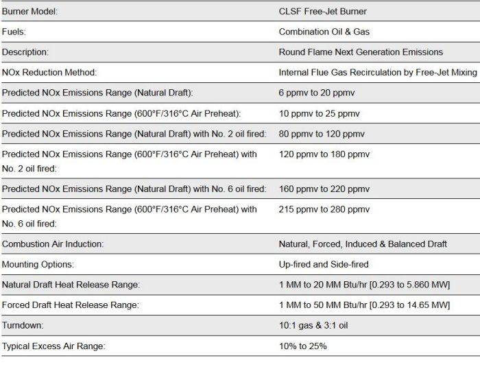 The Zeeco CLSF Free-Jet burner is a Next Generation emissions round flame combination burner.The picture (right) is Zeeco’s CLSF Free-Jet combination burner in operation at our combustion test facility. This design offers state-of-the-art NOx reduction for combination oil and gas firing. NOx reduction for gas firing is achieved by the Free-Jet method of mixing the fuel gas with the inert products of combustion before the combustion occurs, resulting in lower thermal NOx production. The reduced NOx emissions from oil firing is achieved by “Pseudo Staging” of oil by our CB oil gun design. The result is a burner that can achieve very low NOx emissions with superior turndown. For natural draft applications, the burner is offered with a regen tile for oil stabilization. In forced draft applications, the burner is offered with a regen tile, cone or swirler depending upon the combustion air pressure drop available and customer requirements.