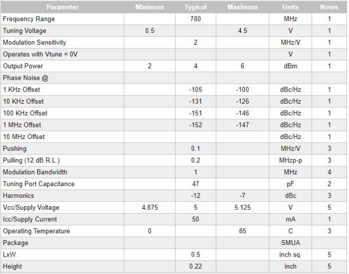 Category : Coaxial Resonator Based Oscillators. Model Number : 0780SMUA5CR. Frequency (MHz) ; 780. Tuning Voltage (VDC) : 0.5 - 4.5. Tuning Sensitivity (MHz/V) : -. VCC (VDC) : 5. ICC (mA) : 50. Output Power (dBm) : 4. Output 2nd Harmonic (dBc) : -12. Phase Noise @ 10 KHz : -131.