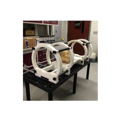 Prototype device at left is 8’ long with a 35” diameter. ~600 lbs., sized for human patients. Prototype device at right is 4’ long with an 18” diameter, shown here treating mice. Both devices use wall power, generate no heat, require minimal shielding and no floor supports. Commercial veterinary device will be between the two sizes. Device ensures a uniform electric field throughout the patient area and a pulse pattern optimized to open sodium channels. Designed and manufactured by The Phantom Laboratory in Greenwich, NY.