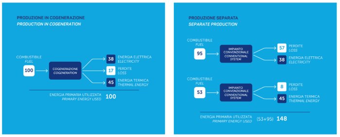 When we speak of cogeneration, in fact, we are referring to a process that enables the simultaneous production of electricity and heat from a single fossil fuel or renewable form of energy (natural gas, biogas, vegetable oil). In order to do so, innovative technologies and high efficiency are needed in order to ensure a significant energy savings far superior to traditional methods: the latter, in fact, do not make use of the thermal energy used in combustion.