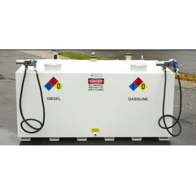 Double wall combination 250/250-gallon double wall, diesel and gas dispensing tank with 120 volt pumps, venting, and level gauges. 72” long, 48” wide, 41” high, 1,300# empty.