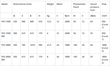 - Ventilation flow rates similar to conventional fans and with the advantage of work from sunrise to sunset without network energy consumption.