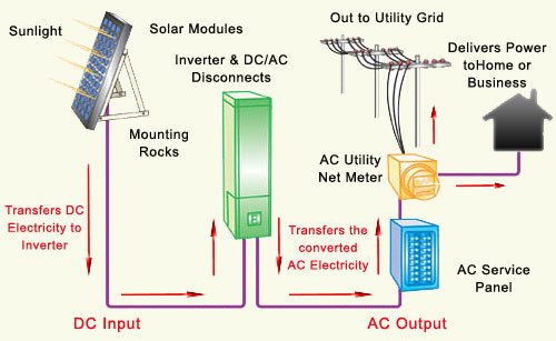This power is sent to a device called an inverter (or power converter) which converts the DC power from the solar modules to AC power identical to that being sent to you from the utility grid. - Electrical Panel