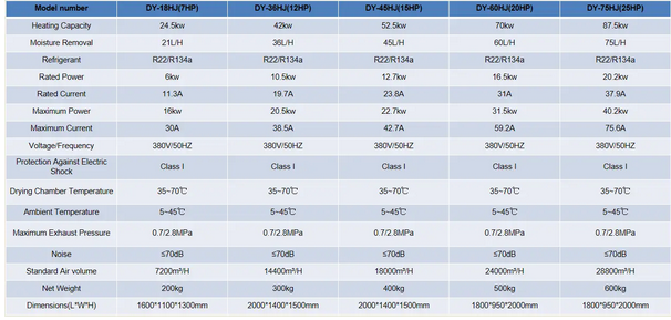 - Energy saving: The dryer adopts heat pump heating method, 1kw heat produced by using heat pump equals 3-4 kw by electric heater under normal conditions,which greatly reduces the production cost. Compared with traditional electric heating dryers,it saves 70% of electricity with very low energy consumption.