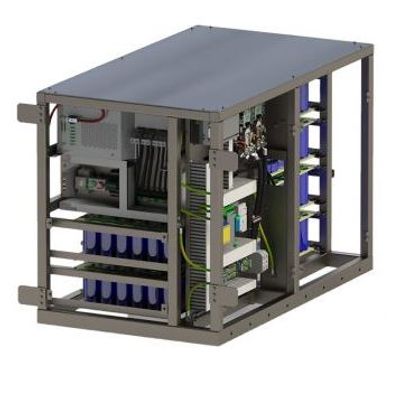This combined energy storage and power electronics system has a complete welded frame with protective covers and can be used in applications with extreme environments and shock and vibrations.