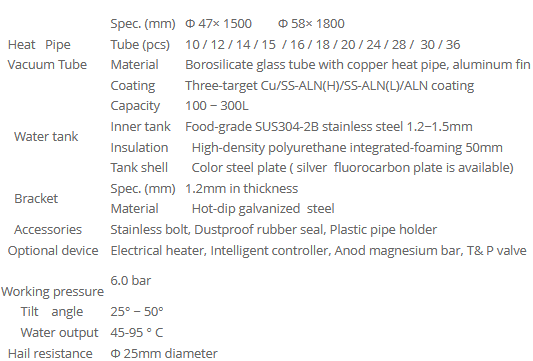 - Heat pipe Vacuum tube: 58x1800mm , Material: High borosilicate glass, three-layer coated vacuum tube. Over 15 years service life. Hail resistance: 25mm.
