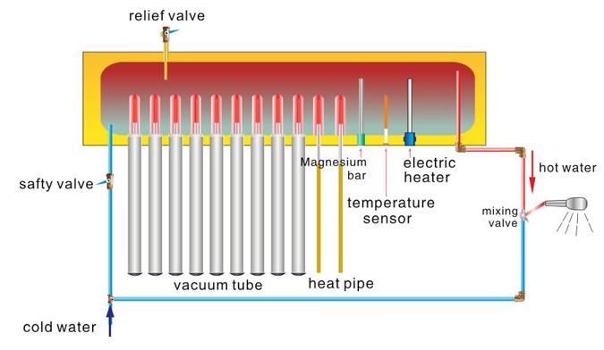 Works with high pressure. Therefore, the warm water conies out with pressure too. It uses the heat pipe to delivery heat energy; water is heated rapidly. Each tube can work alone, so it can work even if one tube is broken.