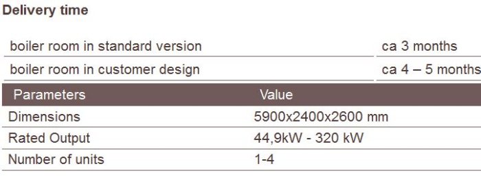 The boiler room is built into the transport ISO 20 `container (5900×2400×2600 mm). It can be equipped with 1 - 4 units of automatic pellet boilers KP 50/51/62, on request also other types of KP. This solution includes a hydraulic system that allows connection of boilers to the heating system in one defined place. Also includes system of measurement and regulation of boiler room. On request it can be equipped with a communication module for remote control. Can be equipped with separate hydraulic ouputs for multiple heating circuits with independent measurements of taken heat. Boiler room can also be equipped with a solar system with, buffer vessel and DHW tank.