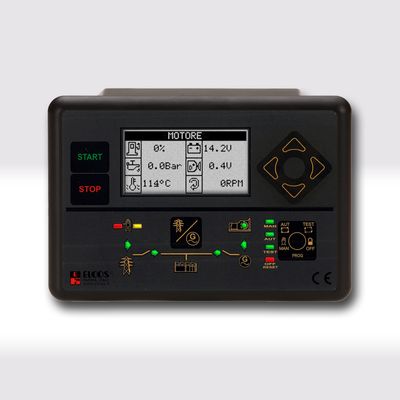 Auto Mains Failure control unit for panel of a emergency gen-set, with digital instruments, monitoring and alarms on the graphic LCD display (with touch screen) in different languages, equipped with CAN BUS (SAE J1939) and with several serial connections and remote control.