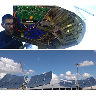 The SST CPV Dish from Southwest Solar Technology is a sophisticated concentrated photovoltaic system designed to optimize solar energy collection in harsh environmental conditions, such as high temperatures and desert regions. Unlike traditional CPV designs that employ lenses, this dish utilizes a 'dense array' CPV module as a building block, rated at a nominal 1 kW. It features a water-cooling system similar to automobile engine cooling, enabling dry-air cooling that conserves water resources while effectively managing thermal output for solar cells operating under intense sunlight exposure, exceeding 1000 suns. The system incorporates high-efficiency CPV 'multi-junction' PV cell technology, with a target cost of under $2 per watt in mass production, and upgrades are anticipated to elevate its power rating to approximately 1.7 kW. A two-axis tracking mechanism ensures optimal energy collection, increasing output by 20-30% compared to similar fixed systems, while offering higher annual productivity compared to trough or tower solar systems.