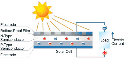 Solar cells utilize silicon as a semiconductor material. The cells are then assembled into a solar module that converts sunlight directly into electricity. When sunlight is absorbed by the silicon material, solar energy knocks the electrons free in the silicon crystal structure, allowing the electrons to flow through the silicon material to generate electricity. Converting light (photon) into electricity (voltage) is called the photovoltaic effect. Solar modules produce DC current that is converted into AC current when the solar system is connected to a house through a grid connection.