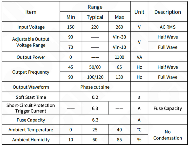 Soft Start: The controller will gently increase output voltage from 0 to the preset value when power on to avoid sudden shake. Fuse-Short Circuit Protection: If output of the controller is short-circuited the fuse inside will be blown to protect the controller and the load.