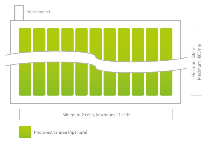 GCell customized solar cells are available in lengths from 50mm to a maximum of 1000mm. The greater the length the greater the current produced by the cell. GCell is also available in widths of 2 cells to a maximum of 11 cells. Each cell has a nominal voltage of 0.45v at 200lux. Our multi-cell structure is linked in series to help achieve a range of voltages up to 4.95v at 200lux. (Higher voltages can be achieved with greater illuminance.)