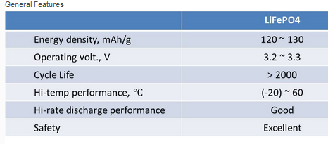 LiFePO4 characterizes with high rate discharging, high temperature, long cycle life and safety. A leading choice for high power applications such as on EV and Engergy Storage.