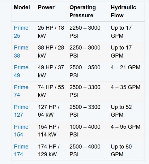 The Prime Hydraulic Power Units are available in multiple powers and models: Prime 25, Prime 38, Prime 49, Prime 74, Prime 127, Prime 154, Prime 174, and Prime 500