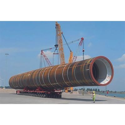 Monopiles are foundation structures that typically have a diameter ranging from 7 to 15 metres (23’ to 50’); they are made of steel, using plate up to 4 or 4,5 metres (13’ or 15’) width and thicknesses varying between 50 and 170 millimetres (2" to 7"). Monopiles sections are cylindrical and conical in shape. Their maximum length can reach between 80 and 120 metres (262’ and 394’); they weigh between 3,000 and 4,000 tons. Monopiles are designed to be driven into the seabed and provide support for wind turbine towers. They are used in water depths ranging from 50 to 60 metres (164’ to 196’). The angle of conicity, which is the tapering of the conical part of the structure, varies between 10 and 16 degrees.