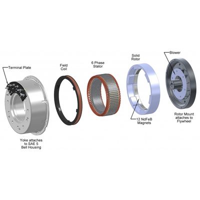 Polar Power first tested its DC Alternator using its Permanent Magnet Hybrid Homopolar (PMHH) technology in 1992. Since then numerous organizations have performed extensive testing on Polar’s generators, including the US Military. Polar Power has met these performance goals through an integrated engineering effort involving detailed analysis of engine, voltage regulation electronics, field coil, magnet, stator, rotor, and diode effects on the generators output voltage, current, and electrical quality. Polar Power selected and optimized the 6200 series alternator using our PMHH technology because it does not require brushes, slip rings, rotating fields, exciters, or field flashing. Its small and compact design allows the use of a bearing-less pancake design.