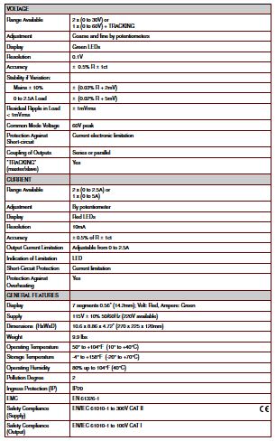 The Model AX502 offers dual 30V outputs. It provides the ability to display both voltage and current for each output. The Model AX502 offers a unique master/slave tracking arrangement whereby the ratio between the master and slave can be setup on the fly as needed during the test. Adjusting the master voltage causes the slave to track. Adjusting the slave voltage causes the ratio from master to slave to change accordingly. It offers a Coarse and Fine voltage adjustment as well as a current limiting adjustment. It is built to provide many years of reliable, precise, easy-to-use operation and will be a welcome addition to any lab, test bench or production line.